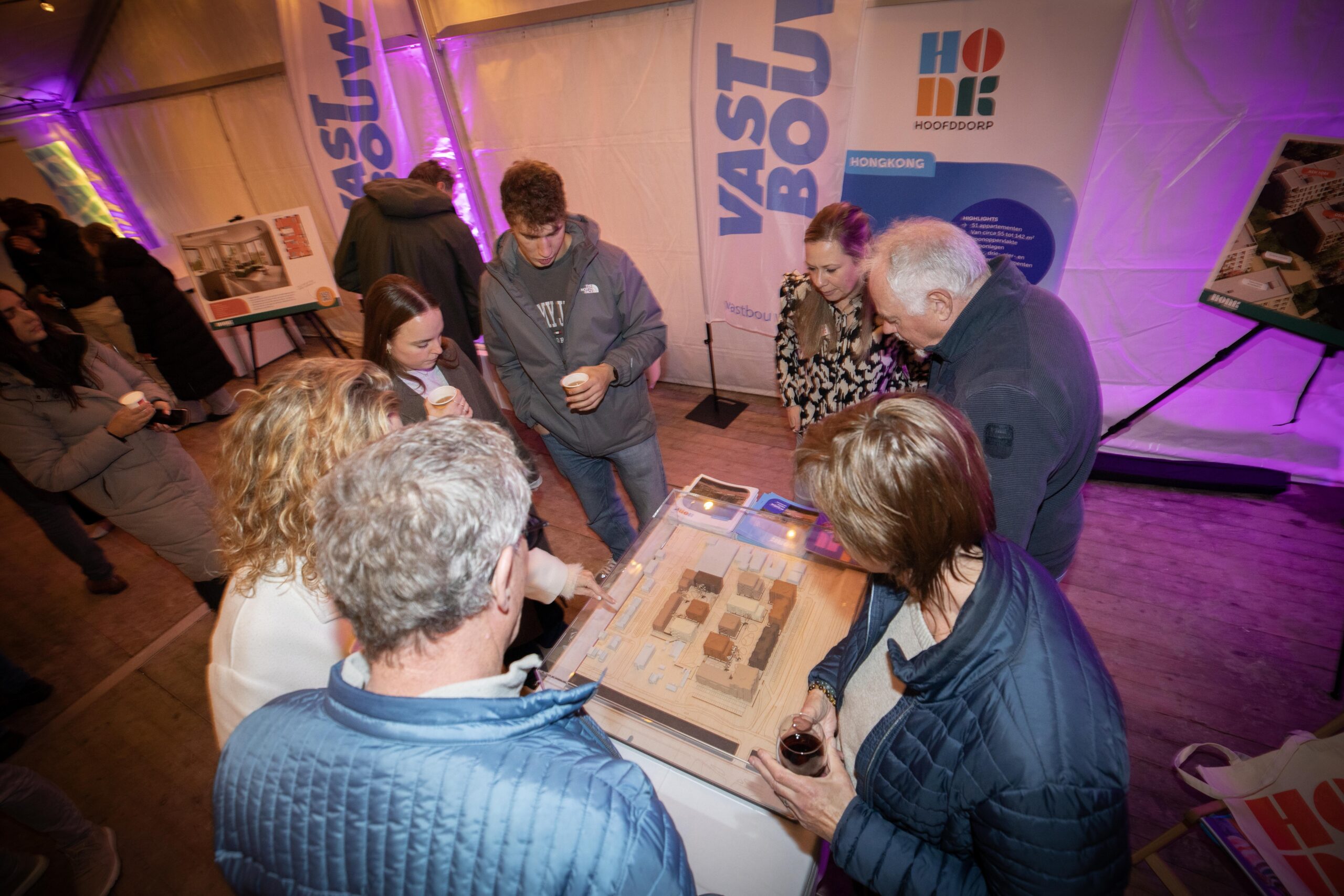 Wat een geslaagde avond! Dinsdag 28 oktober vierden we samen de officiële start van de bouw van HONK Hoofddorp. Vanaf half zes liep de tent op de bouwlocatie langzaam vol met genodigden, kopers en geïnteresseerden. Een levendige mix van mensen: van starters tot doorstromers, van nieuwsgierige buurtbewoners tot toekomstige bewoners… allemaal met één ding gemeen: interesse in wonen in HONK.